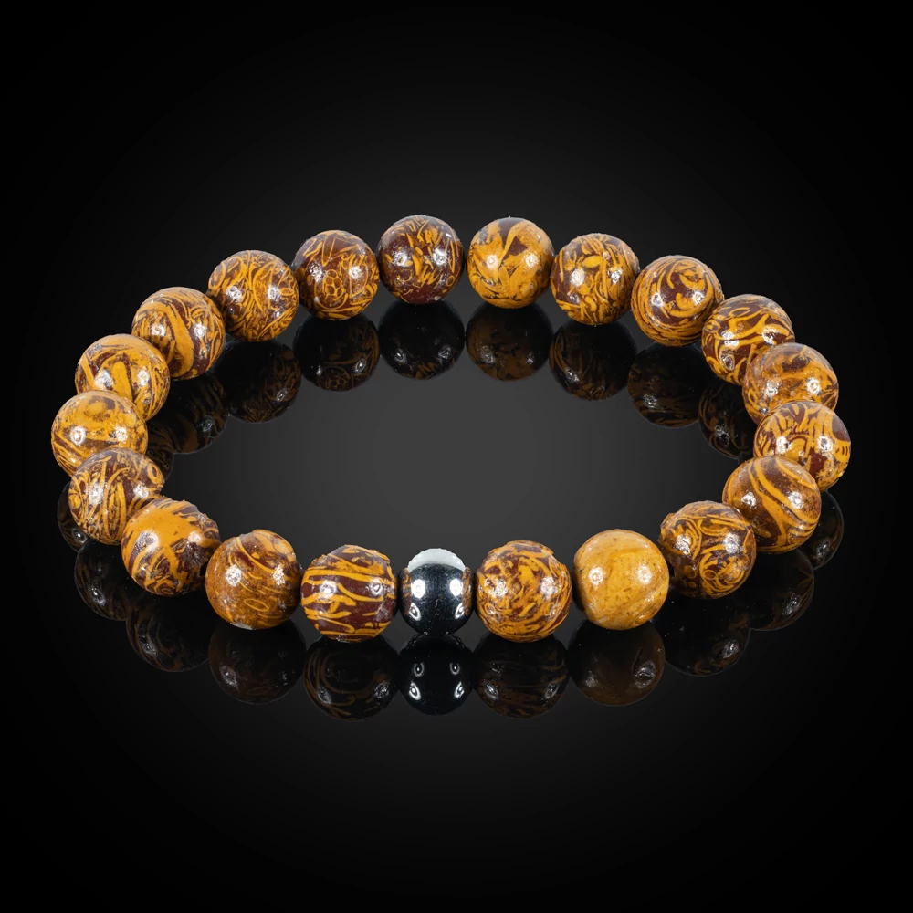 Termék paraméterei: 8 mm-es gyöngyökből készült rugalmas, elefántbőr jáspis karkötő, egyedileg választható nemesacélos fémalkatrésszel, több méretben. A fém golyók mérete: 8 mm, a "kocka" mérete: 5×5 mm, a szív mérete: 8,5×10,5 mm, melyek közül 1 db választható. Ezek funkciója a gumidamil elkötéséből keletkező csomó eltakarása, a karkötő egyediségének fokozása. Amennyiben nem kerül kiválasztásra a fém és a karkötő mérete, abban az esetben egy átlag 18 cm-es karkötőt küldünk, a fényes (1. számú) nemesacélos golyóval.