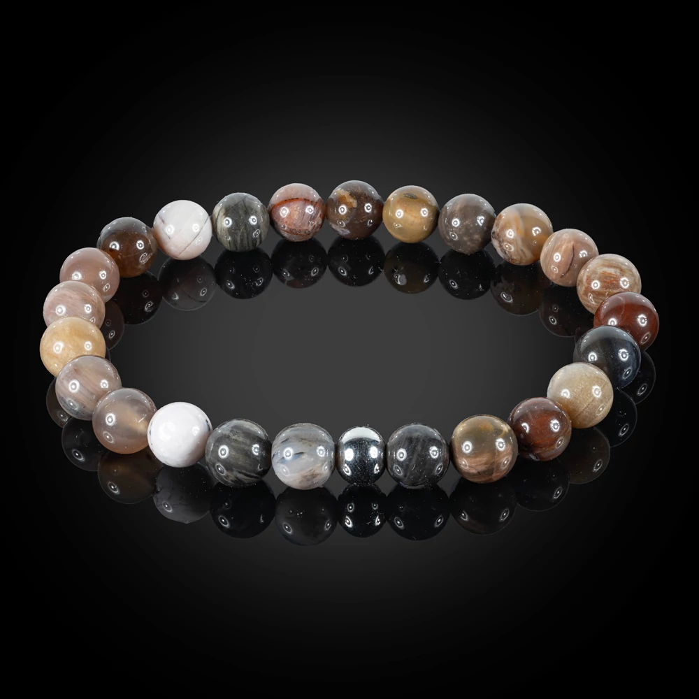 Termék paraméterei: 8 mm-es gyöngyökből készült rugalmas, fa kövület karkötő, egyedileg választható nemesacélos fémalkatrésszel, több méretben. A fém golyók mérete: 8 mm, a "kocka" mérete: 5×5 mm, a szív mérete: 8,5×10,5 mm, melyek közül 1 db választható. Ezek funkciója a gumidamil elkötéséből keletkező csomó eltakarása, a karkötő egyediségének fokozása. Amennyiben nem kerül kiválasztásra a fém és a karkötő mérete, abban az esetben egy átlag 18 cm-es karkötőt küldünk, a fényes (1. számú) nemesacélos golyóval.