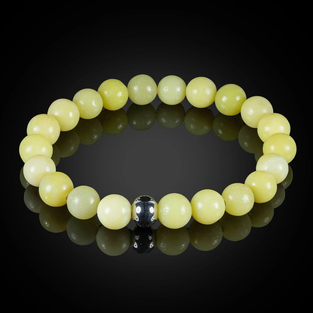 Termék paraméterei: 8 mm-es gyöngyökből készült rugalmas, citrom jáde karkötő, egyedileg választható nemesacélos fémalkatrésszel, több méretben. A fém golyók mérete: 8 mm, a "kocka" mérete: 5×5 mm, a szív mérete: 8,5×10,5 mm, melyek közül 1 db választható. Ezek funkciója a gumidamil elkötéséből keletkező csomó eltakarása, a karkötő egyediségének fokozása. Amennyiben nem kerül kiválasztásra a fém és a karkötő mérete, abban az esetben egy átlag 18 cm-es karkötőt küldünk, a fényes (1. számú) nemesacélos golyóval.