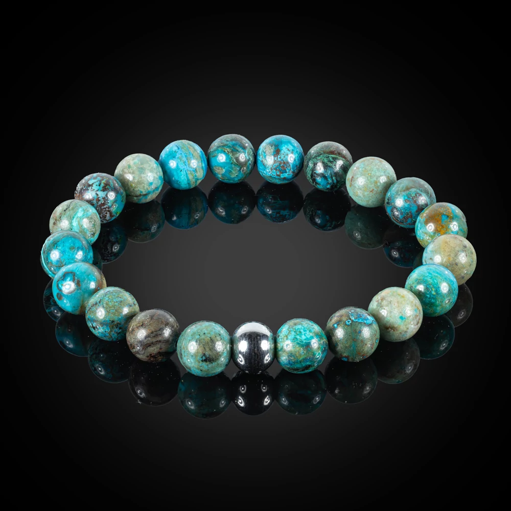 Termék paraméterei: 8 mm-es gyöngyökből készült rugalmas, krizokolla karkötő, egyedileg választható nemesacélos fémalkatrésszel, több méretben. A fém golyók mérete: 8 mm, a "kocka" mérete: 5×5 mm, a szív mérete: 8,5×10,5 mm, melyek közül 1 db választható. Ezek funkciója a gumidamil elkötéséből keletkező csomó eltakarása, a karkötő egyediségének fokozása. Amennyiben nem kerül kiválasztásra a fém és a karkötő mérete, abban az esetben egy átlag 18 cm-es karkötőt küldünk, a fényes (1. számú) nemesacélos golyóval.