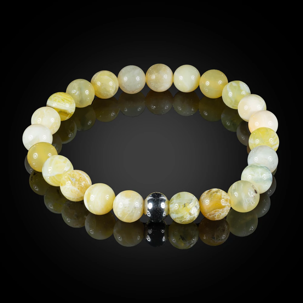 Termék paraméterei: 8 mm-es gyöngyökből készült rugalmas, sárga opál karkötő, egyedileg választható nemesacélos fémalkatrésszel, több méretben. A fém golyók mérete: 8 mm, a "kocka" mérete: 5×5 mm, a szív mérete: 8,5×10,5 mm, melyek közül 1 db választható. Ezek funkciója a gumidamil elkötéséből keletkező csomó eltakarása, a karkötő egyediségének fokozása. Amennyiben nem kerül kiválasztásra a fém és a karkötő mérete, abban az esetben egy átlag 18 cm-es karkötőt küldünk, a fényes (1. számú) nemesacélos golyóval.