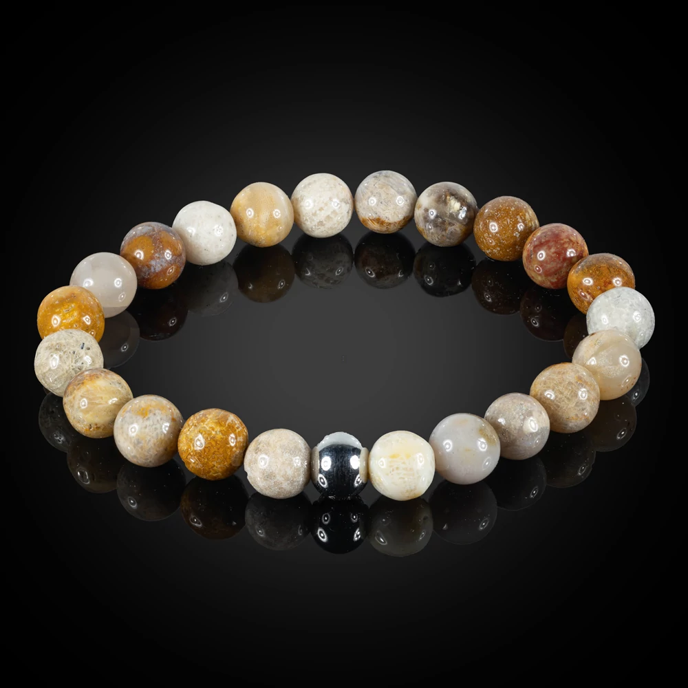 Termék paraméterei: 8 mm-es gyöngyökből készült rugalmas, korall kövület karkötő, egyedileg választható nemesacélos fémalkatrésszel, több méretben. A fém golyók mérete: 8 mm, a "kocka" mérete: 5×5 mm, a szív mérete: 8,5×10,5 mm, melyek közül 1 db választható. Ezek funkciója a gumidamil elkötéséből keletkező csomó eltakarása, a karkötő egyediségének fokozása. Amennyiben nem kerül kiválasztásra a fém és a karkötő mérete, abban az esetben egy átlag 18 cm-es karkötőt küldünk, a fényes (1. számú) nemesacélos golyóval.