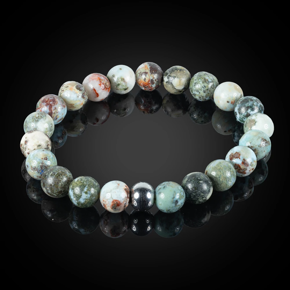 Termék paraméterei: 8 mm-es gyöngyökből készült rugalmas, larimár karkötő, egyedileg választható nemesacélos fémalkatrésszel, több méretben. A fém golyók mérete: 8 mm, a "kocka" mérete: 5×5 mm, a szív mérete: 8,5×10,5 mm, melyek közül 1 db választható. Ezek funkciója a gumidamil elkötéséből keletkező csomó eltakarása, a karkötő egyediségének fokozása. Amennyiben nem kerül kiválasztásra a fém és a karkötő mérete, abban az esetben egy átlag 18 cm-es karkötőt küldünk, a fényes (1. számú) nemesacélos golyóval.