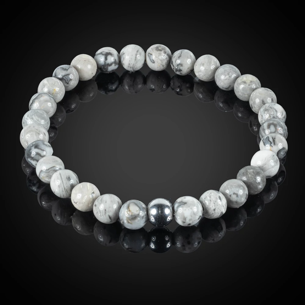 Termék paraméterei: 6 mm-es gyöngyökből készült rugalmas, térkép jáspis karkötő, egyedileg választható nemesacélos fémalkatrésszel, több méretben. A fém golyók mérete: 6 mm, a "kocka" mérete: 5×5 mm, melyek közül 1 db választható. Ezek funkciója a gumidamil elkötéséből keletkező csomó eltakarása, a karkötő egyediségének fokozása. Amennyiben nem kerül kiválasztásra a fém és a karkötő mérete, abban az esetben egy átlag 18 cm-es karkötőt küldünk, a fényes (1. számú) nemesacélos golyóval.