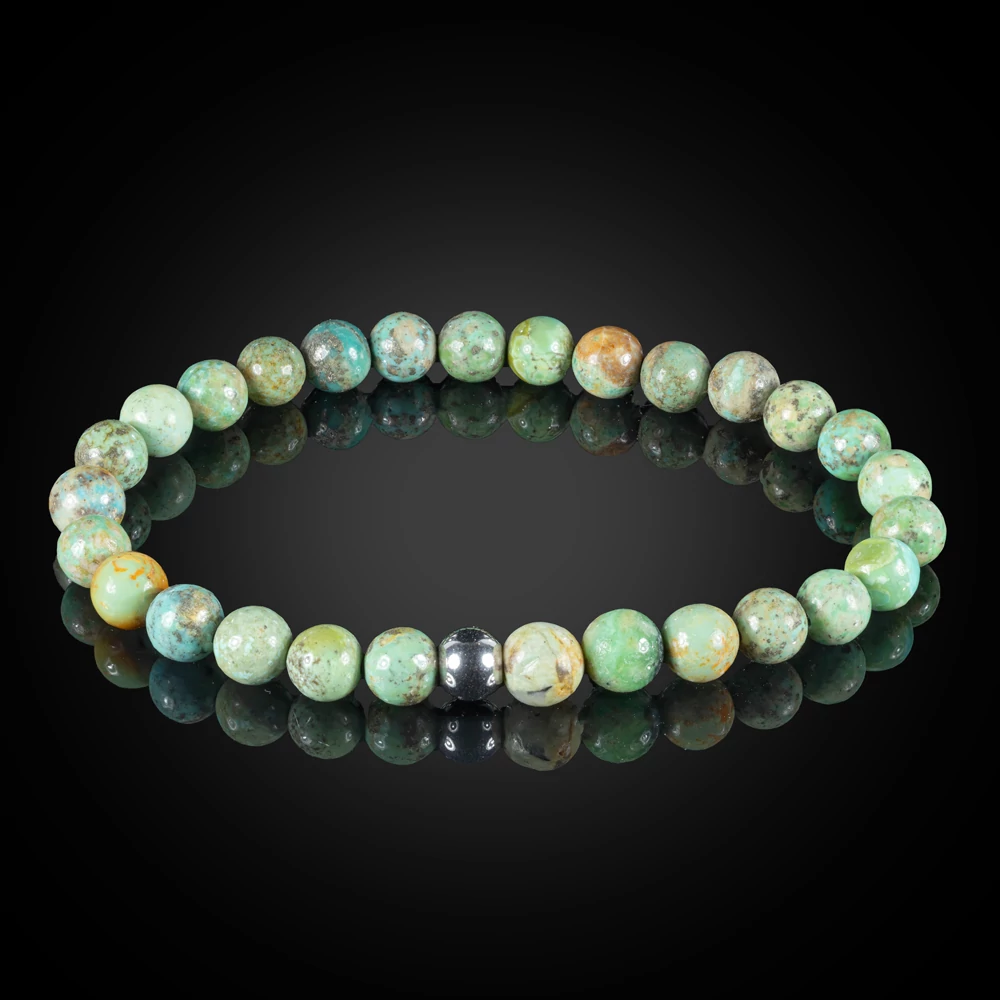 Termék paraméterei: 6 mm-es gyöngyökből készült rugalmas, türkiz karkötő, egyedileg választható nemesacélos fémalkatrésszel, több méretben. A fém golyók mérete: 6 mm, a "kocka" mérete: 5×5 mm, melyek közül 1 db választható. Ezek funkciója a gumidamil elkötéséből keletkező csomó eltakarása, a karkötő egyediségének fokozása. Amennyiben nem kerül kiválasztásra a fém és a karkötő mérete, abban az esetben egy átlag 18 cm-es karkötőt küldünk, a fényes (1. számú) nemesacélos golyóval.