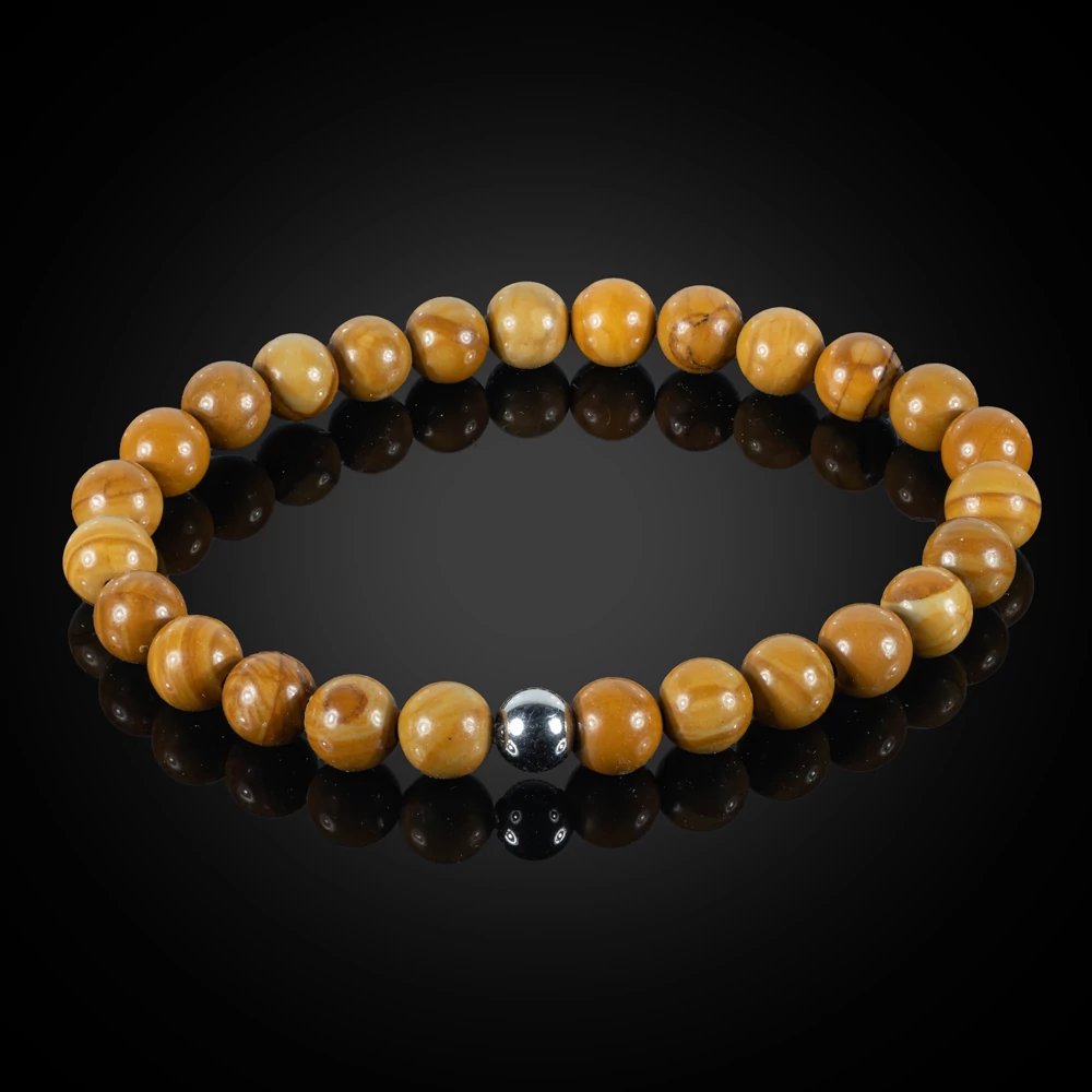 Termék paraméterei: 6 mm-es gyöngyökből készült rugalmas, woodlace achát karkötő, egyedileg választható nemesacélos fémalkatrésszel, több méretben. A fém golyók mérete: 6 mm, a "kocka" mérete: 5×5 mm, melyek közül 1 db választható. Ezek funkciója a gumidamil elkötéséből keletkező csomó eltakarása, a karkötő egyediségének fokozása. Amennyiben nem kerül kiválasztásra a fém és a karkötő mérete, abban az esetben egy átlag 18 cm-es karkötőt küldünk, a fényes (1. számú) nemesacélos golyóval.