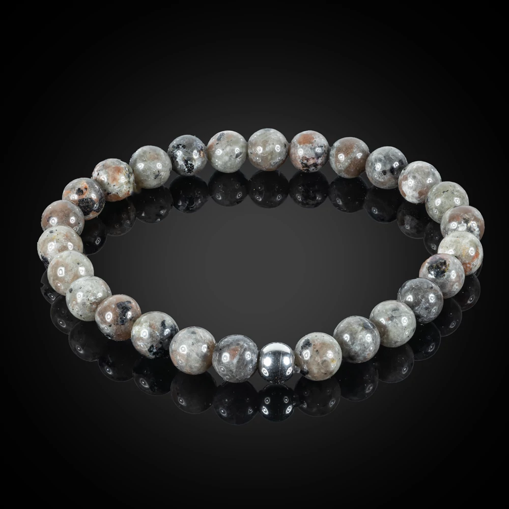 Termék paraméterei: 6 mm-es gyöngyökből készült rugalmas, yooperlite karkötő, egyedileg választható nemesacélos fémalkatrésszel, több méretben. A fém golyók mérete: 6 mm, a "kocka" mérete: 5×5 mm, melyek közül 1 db választható. Ezek funkciója a gumidamil elkötéséből keletkező csomó eltakarása, a karkötő egyediségének fokozása. Amennyiben nem kerül kiválasztásra a fém és a karkötő mérete, abban az esetben egy átlag 18 cm-es karkötőt küldünk, a fényes (1. számú) nemesacélos golyóval.